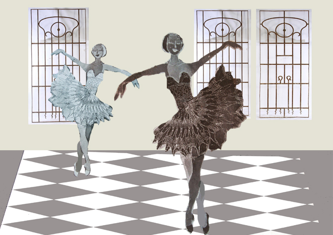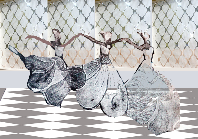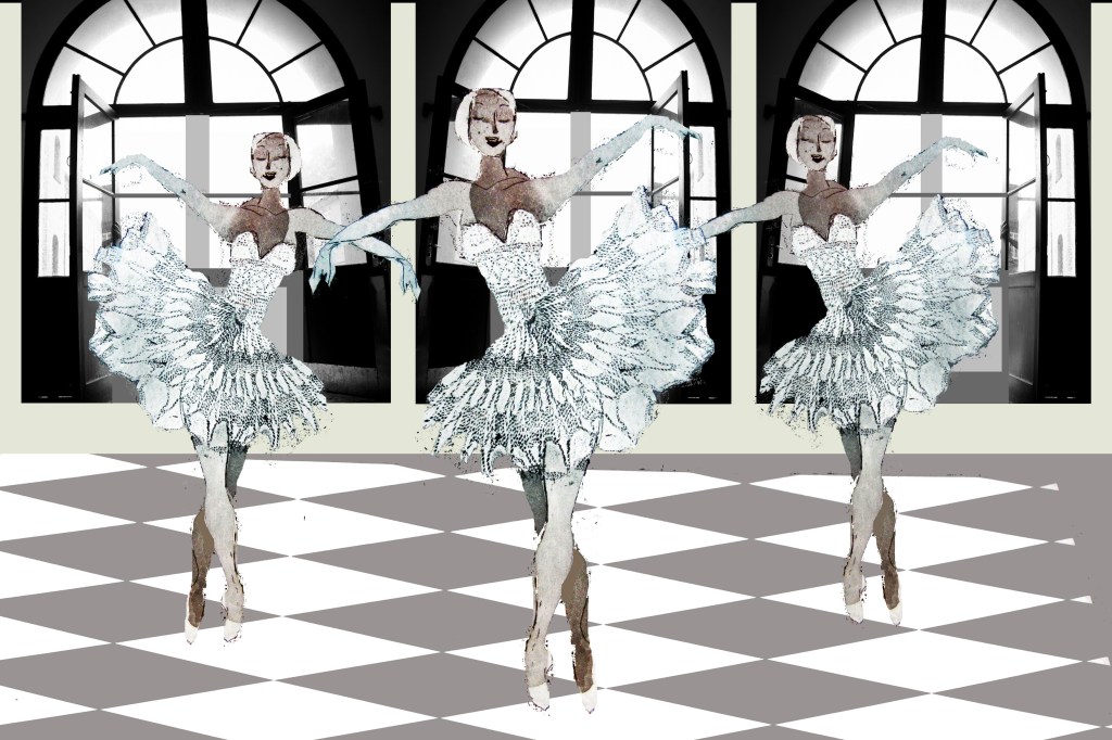 En taida päästä tässä elämässä eroon kollaaseista. Enkä balettitanssitytöistä. Enkä ruutulattioista. En haluakaan. Tässä otsikkokuvassa on kaikki ne elementit, joita pidän esteettisinä. Kuva ei ole mitenkään viimeistelty, mutta siinä on tunnelma tärkein. Tanssija on oma grafiikanvedos. Tein todella töitä, että sain siitä taustan irrotettua. Muut kollaasimateriaalit olen koonnut löytämistäni kuvista.