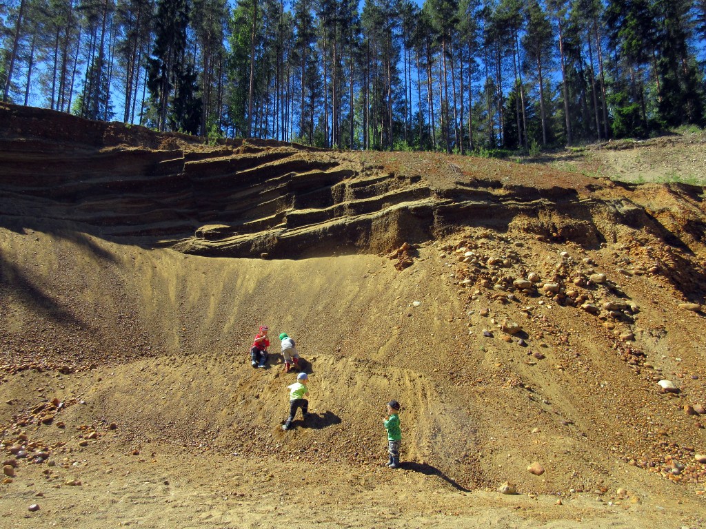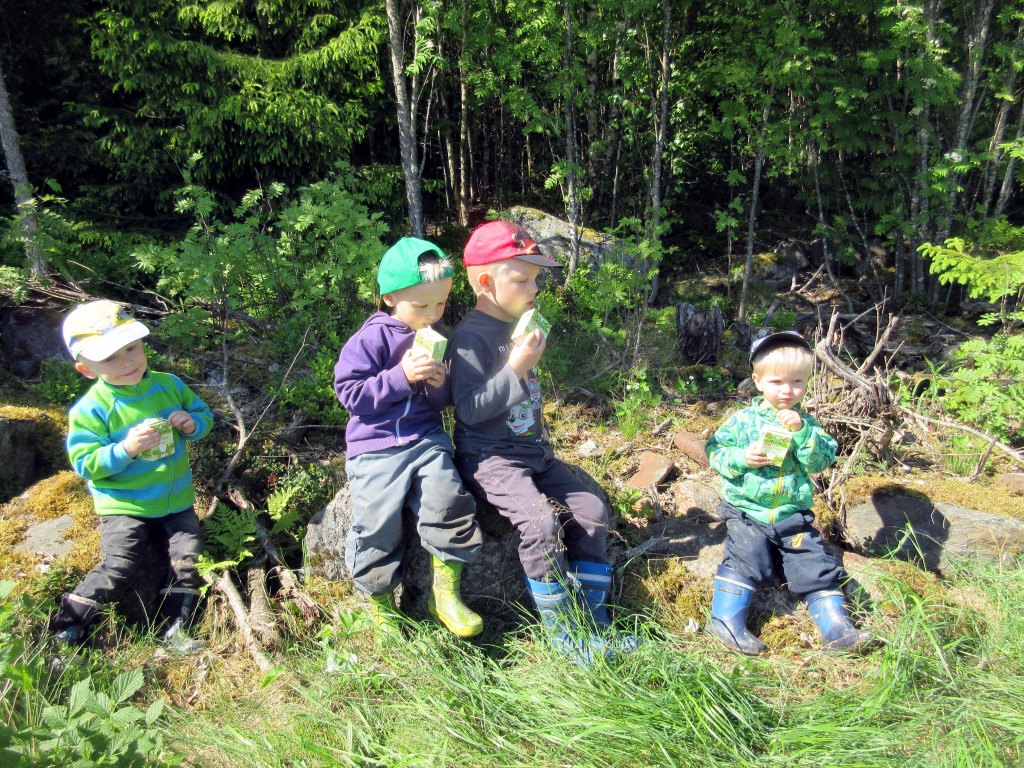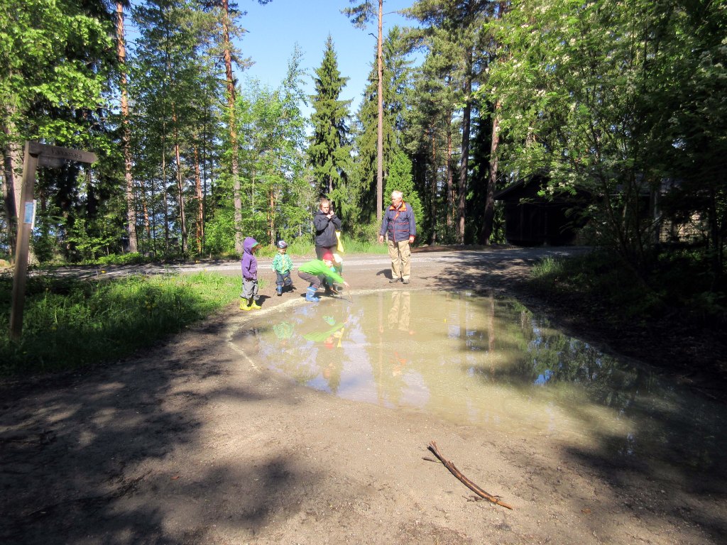 Aurinko helli meitä koko päivän. Mökkipiha lämpenee vasta puolen päivän jälkeen. Siksipä olemme tehneet joka aamu puuron jälkeen pillimehuretken metsätielle. Pojat ovat seuranneet muurahaisten touhuja ja keräilleet keppejä.