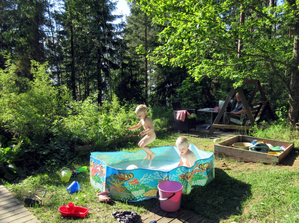 Iltapäivällä pihalla oli paahde. Jussi täytti kahluualtaan. Siitä riitti riemua iltaan asti.