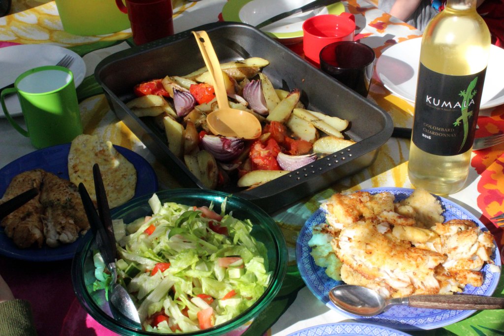 Päiväruoka valmistui muurikalla. Poikien kalat olivat herkullisia. Saimme niiden lisäksi lohifileita, grilliperunoita ja kasviksia kermaviilikastikkeen kera.