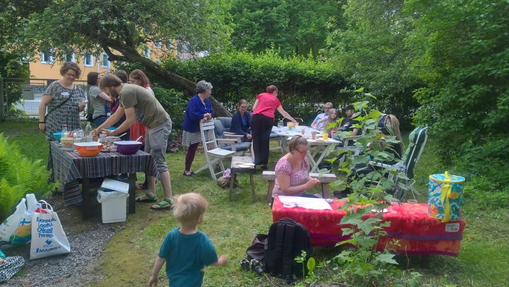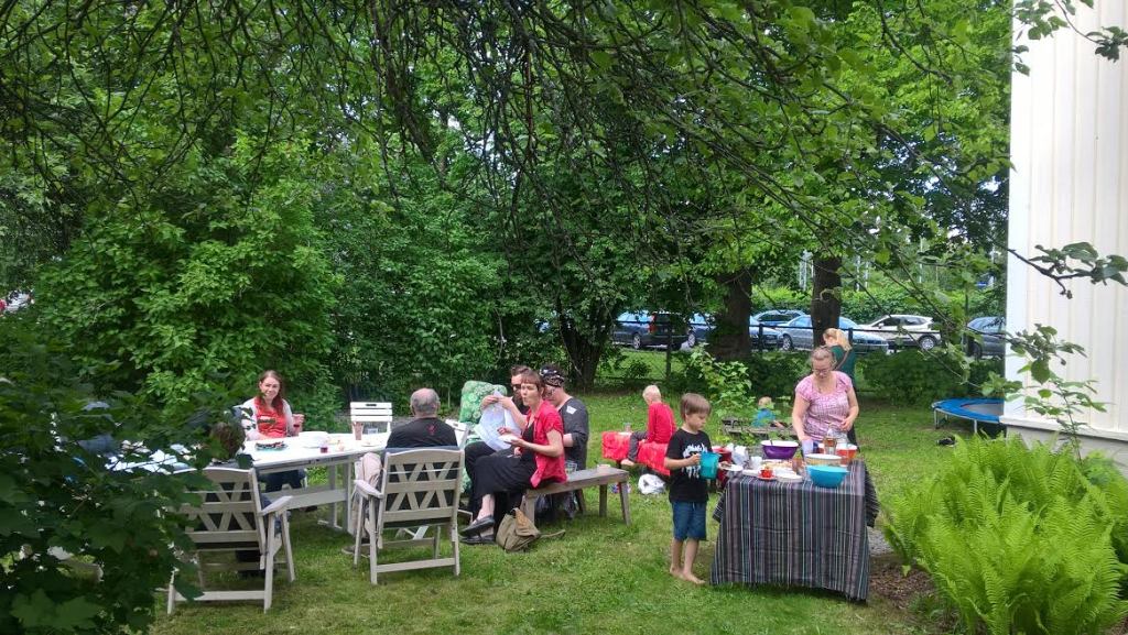 Aseman viereisen valkoisen puutalon pihalle oli katettu nyyttikestipöytä booleineen. Lapsille laitettiin muhkean kokoinen tramboliini.