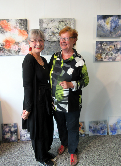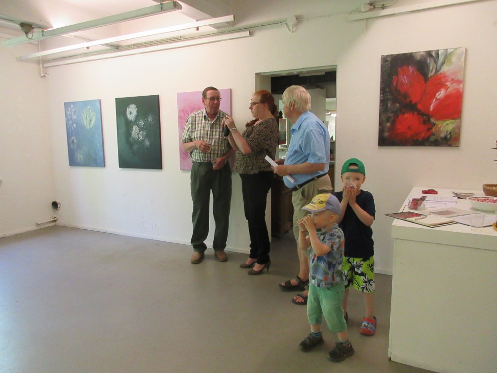 Löysimme Marin galleriasta viimeistelemässä ripustusta. Yleisöä kertyi mukavasti paikalle. Olin laittanut Eero-serkulleni viestin, että nyt on loistava tilaisuus tavata sukulaisia. Hän kun asuu tyttöystävänsä Tainan kanssa Korkeakoskella.
