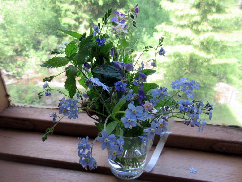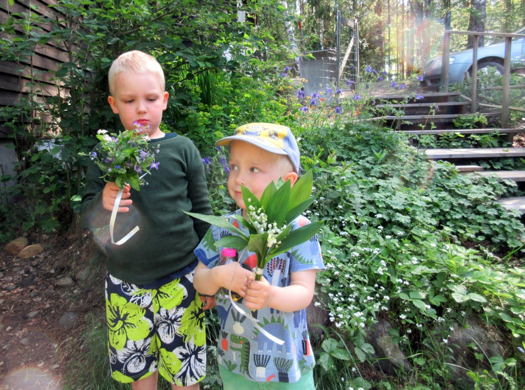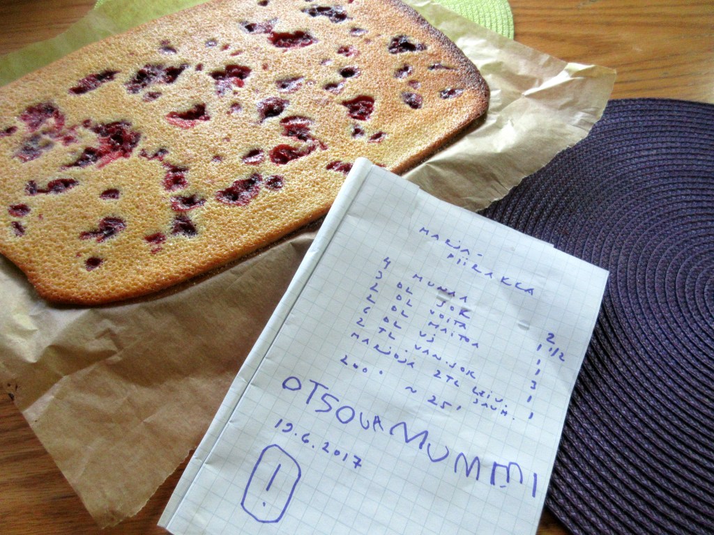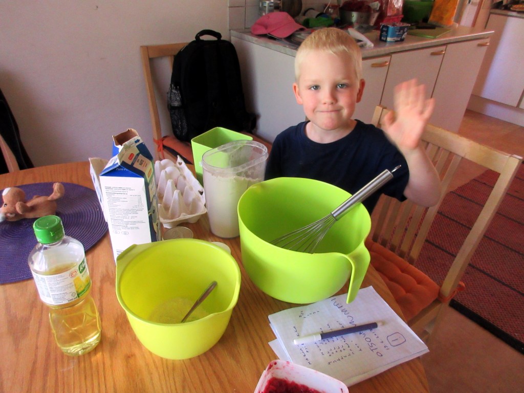Meillä on tiedossa mukava kesäpäivä. Koska aamu oli viileä, aloitimme kokkaushommilla. ”Voidaanko leipoa jotain hyvää, haluan viedä myös kotiin tuliaisia”, poika toivoi.