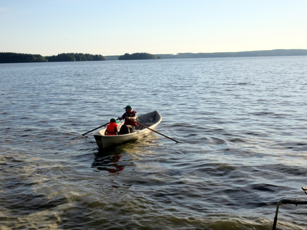 Palasimme mökille vasta illalla. Otso pääsi Miika-isin kanssa kalaan. Riemu oli suuri, kun pojat tulivat rantaan ison ahvenen kanssa.