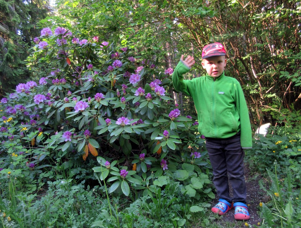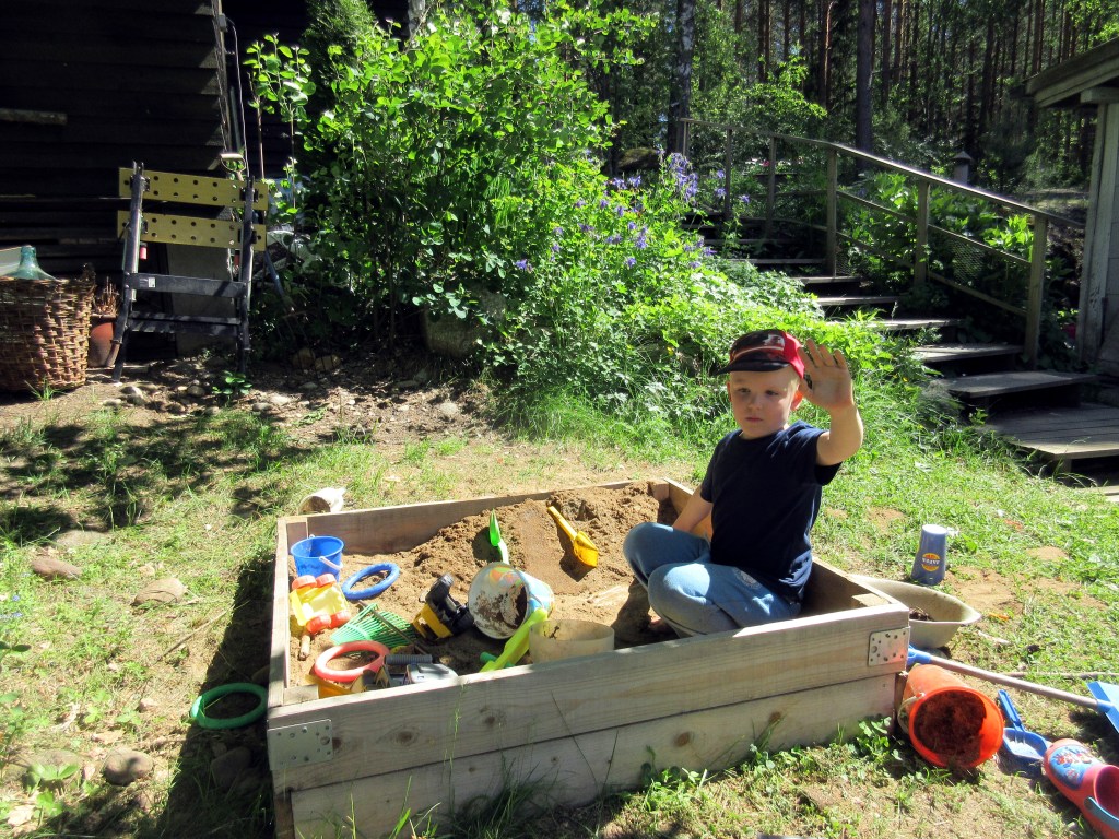 Meillä on nyt uusi vaihe kesänvietossa, sillä Otso 5v jäi ensimmäistä kertaa tänne mökille kesänviettoon ilman vanhempia. Laura, Miika ja Visa heiluttivat illalla ja kaartoivat auton nokan kohti Espoota. Yö sujui rauhallisesti. Nyt aamulla heilutimme Jussi-papalle, joka lähti työnjohtajaksi Annan työmaalle Tapanilaan.