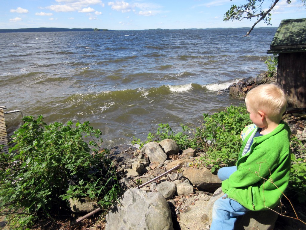 Päivällä teimme metsäretken ja näimme kaksi komeaa kurkea. Kun palasimme, kävimme katsomassa järveä. Vaahtopäät vyöryivät rantaan. Illalla tuuli vain yltyi. Istuimme rantakeinulla ja Otso hihkui, kun vesiroiskeet yltivät puuskittaisen tuulen mukana sinne asti.