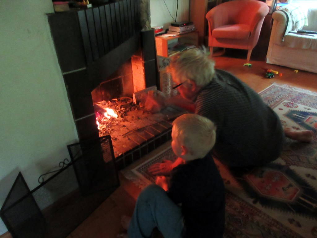 Säätiedotus tiesi, aamulla satoi. Mökissä oli viileää. Jussi-pappa ja Otso sytyttivät takkatulen.