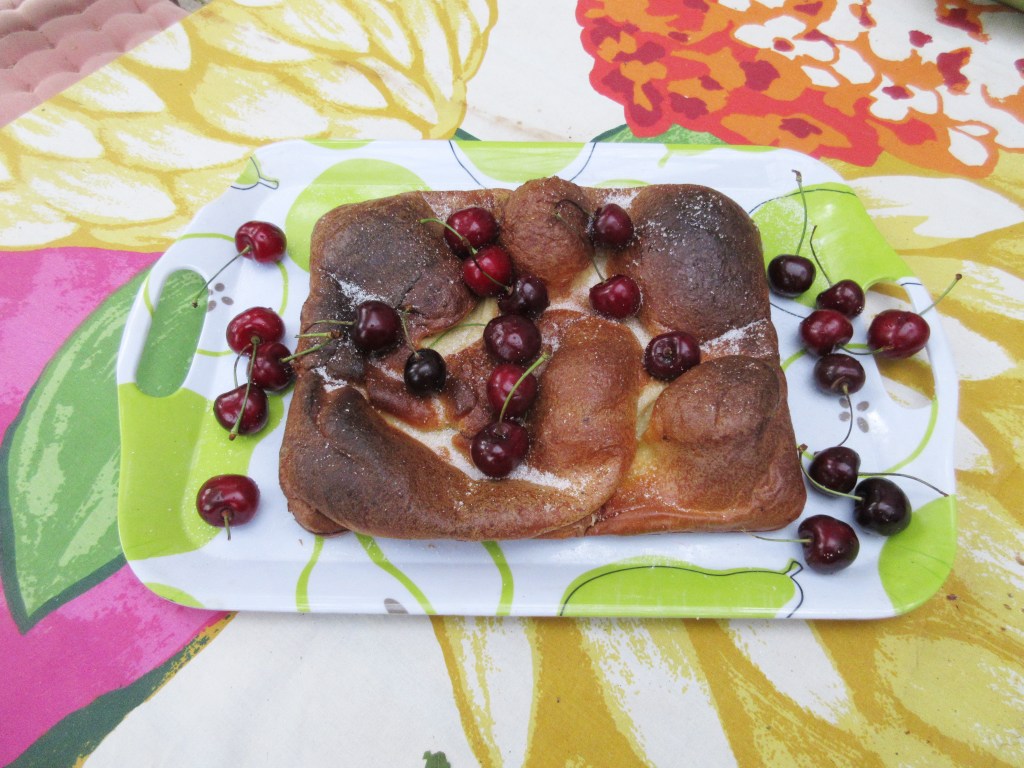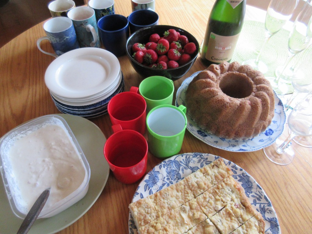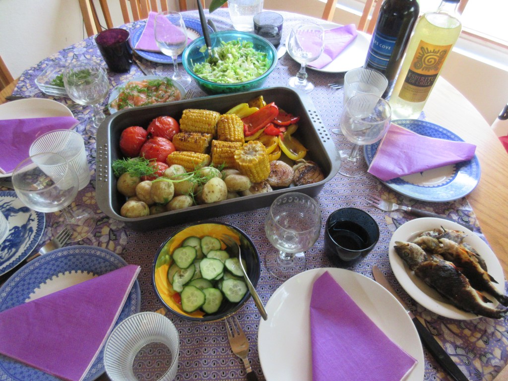 Minä huolehdin perusruuista, Arja ja Laura salaateista, miehet grillasivat ja Miika kävi isojen poikien (=Otso ja Samu) kanssa ahkerasti kalassa. Arja toi tuliaisina mehevän raparperipiirakan ja Laura oli leiponut muhkean piimäkaakun.