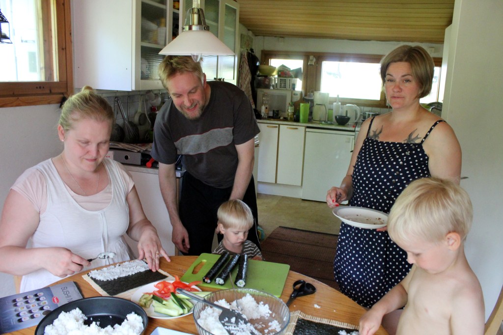 Järjestimme sushitalkoot, joihin pikkumiehetkin osallistuivat. Makirullien kääriminen sujui hyvin.