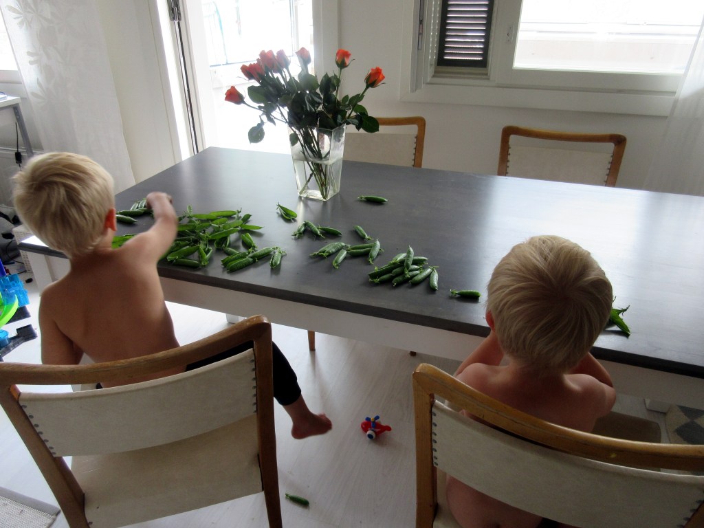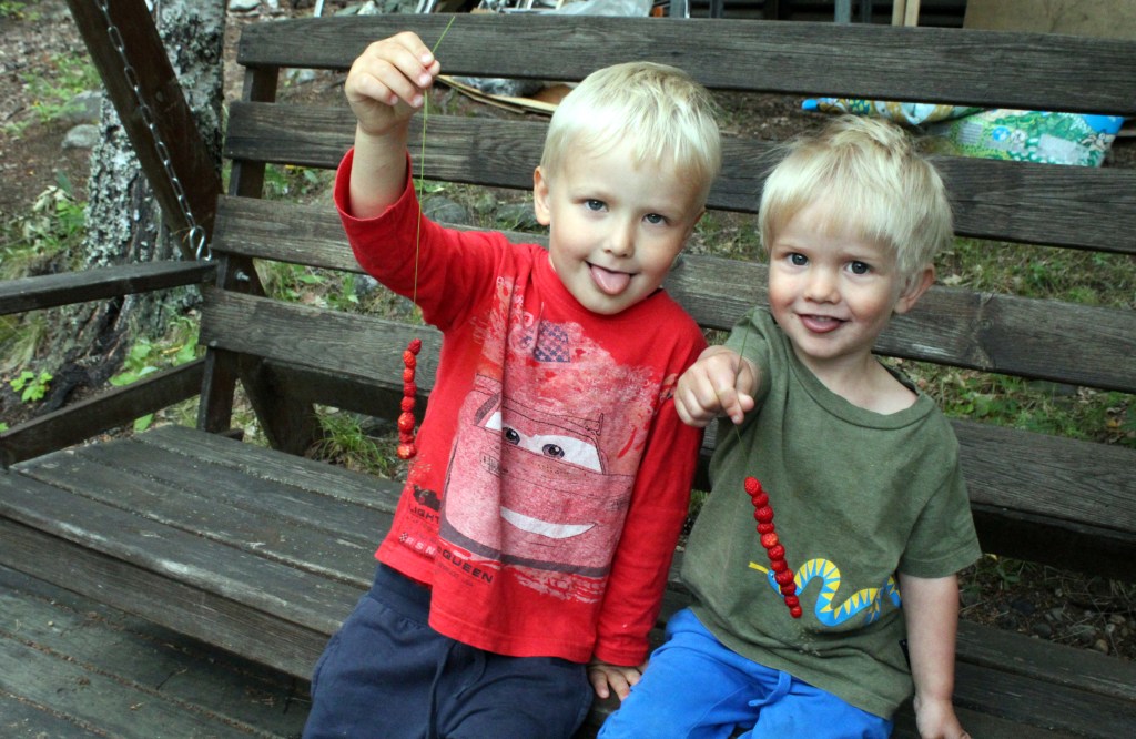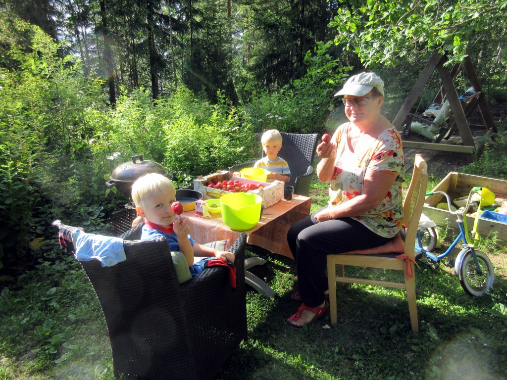 Samu ja Miska riemastuivat, kun ostimme laatikollisen mansikoita ja ison pussillisen herneenpalkoja. Niistä riitti iloa kun palasimme tuuliselle mökille.