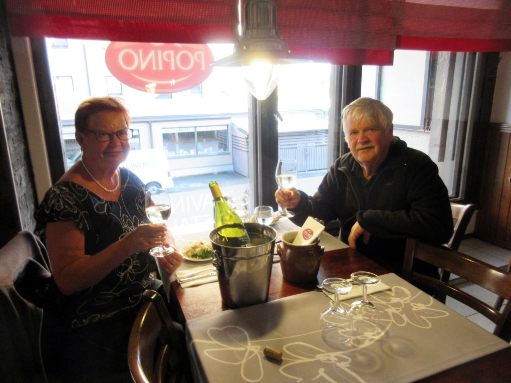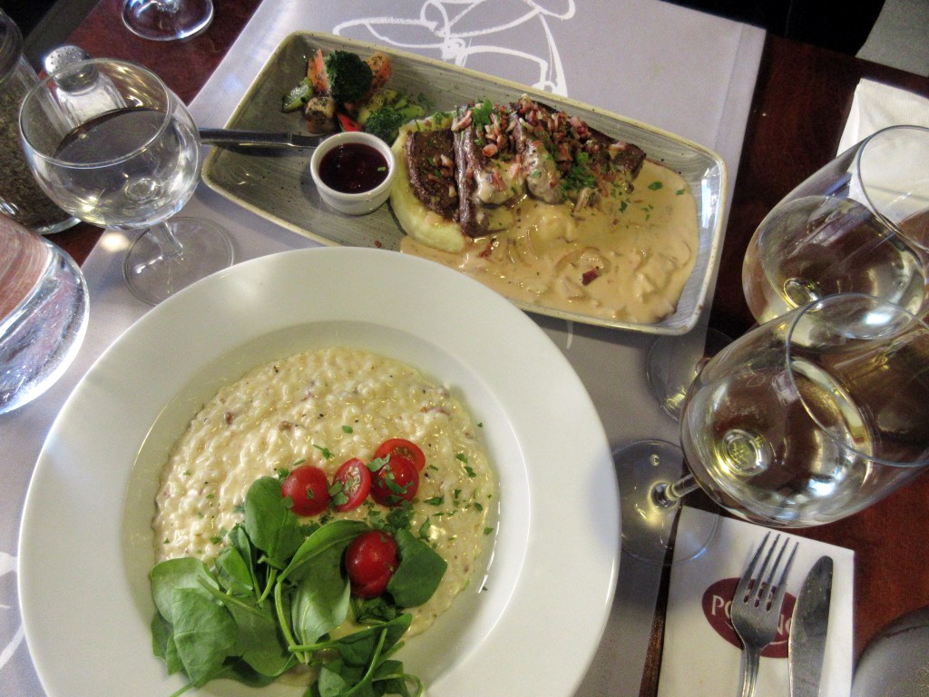 Jussi sai mehevää maksaa, minä tuoreista kantarelleista valmistetun risoton. Nautimme ne kylmän pinot grigio valkoviinin kera. Olimme oikein tyytyväisiä makuelämyksiin.