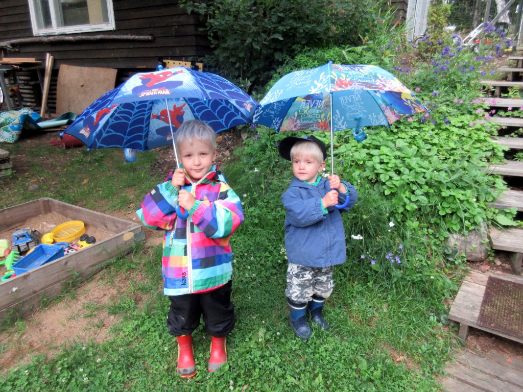 Kesälomalaiset palasivat illalla. Samu ja Miska esittelivät ylpeinä uusia lastensateenvarjojaan. Niillä on tänä kesänä käyttöä.