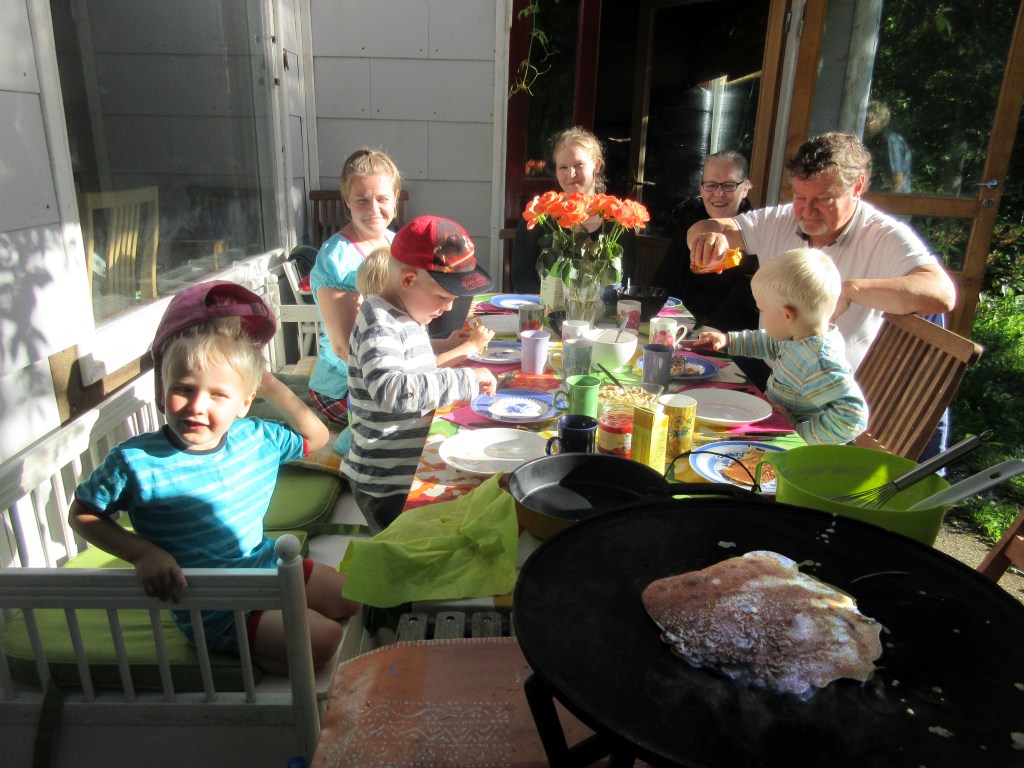 Miika aloitti lomansa ja ehti sopivasti mukaan lettukesteihin. Paistoin herkkuja muurikalla ja letut katosivat pannulta suoraan kesävieraiden suihin. Tarjolla oli sekä suolaisia että makeita täytteitä.