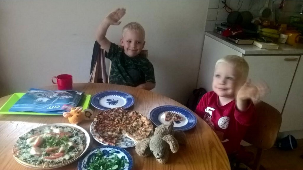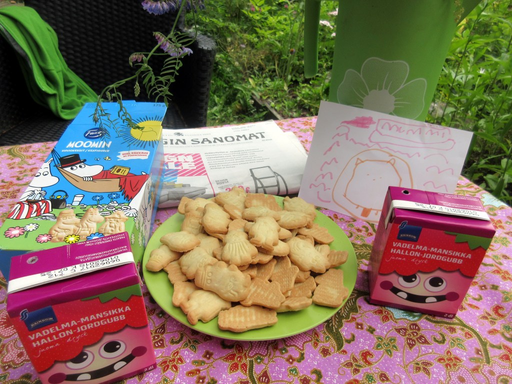 Sain pojat sisälle, kun kyselin apulaisia lettutaikinan tekoon. Apulaisia riitti samoin kuin taikinan maistelijoita. Kun Pikku kakkonen alkoi, pojat tilasivat välipalaa. Tarjosin ruisleipää ja isot banaanit. ”Saadaanko myös muumikeksit?” he toivoivat. ”Montako?” Otso tilasi välittömästi 19 kappaletta. Tinkimisen jälkeen molemmat saivat kolme.