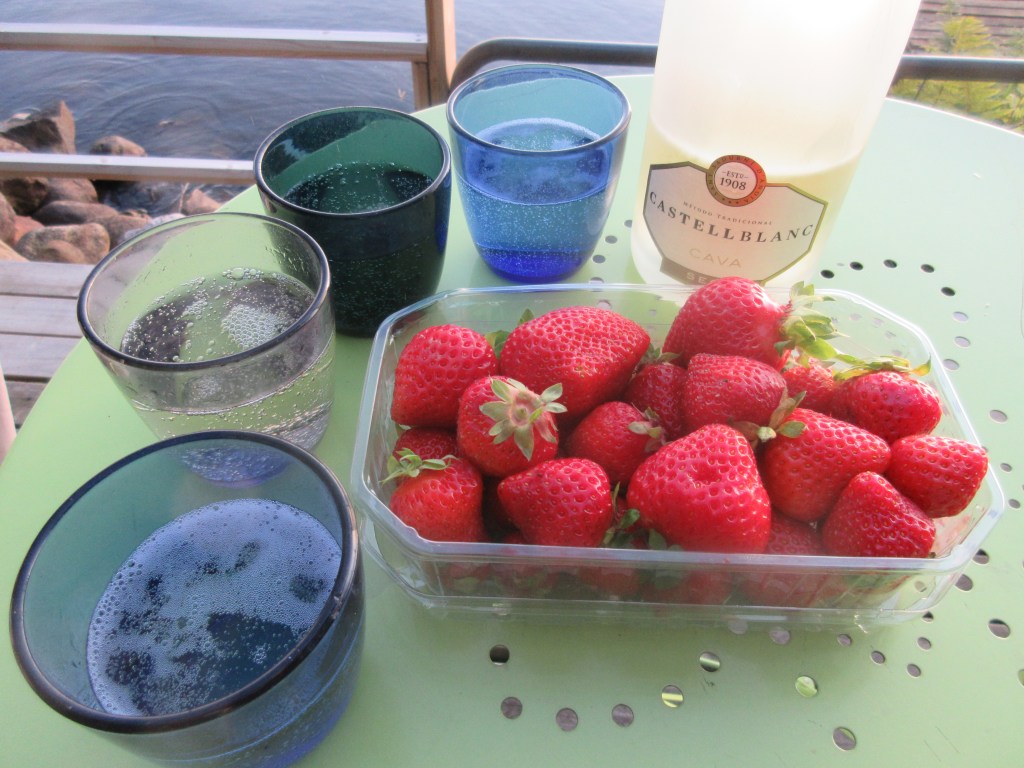 Liekö cavalla ja mansikoilla ollut osuutta asiaan. Iltapala piti kuitenkin nauttia sisällä, sillä ilta viileni. Olimme varanneet tarjolle tuoretta patonkia ja valikoiman juustoa sekä punaviiniä. Kas kummaa, vieraiden tuliaiskorista löytyi täsmälleen samoja aineksia!