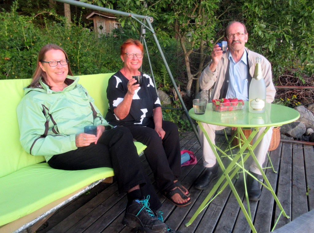 Kaizun tuliaiskorista löytyi Suomi 100 kuohuviiniä ja Jussi oli ostanut proseccoa. Niillä eväillä päivä pääsi käyntiin. Teimme luontoretken kärkeen ja istuimme sen jälkeen keinulla herättelemässä ruokahaluja.