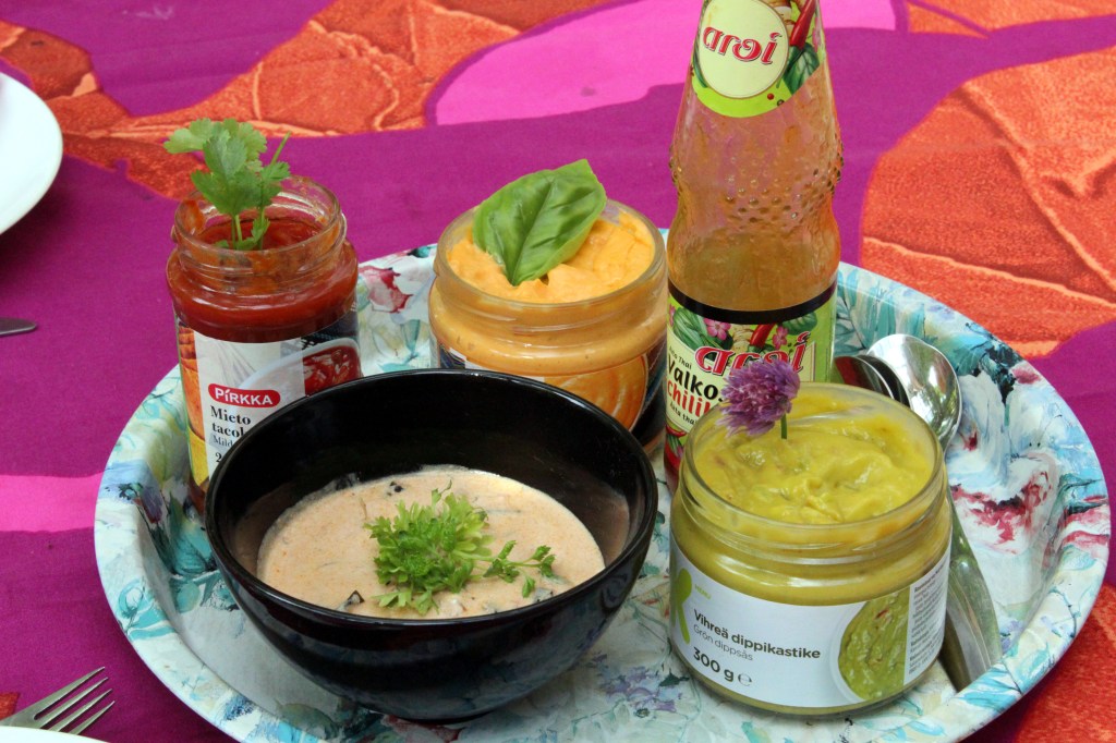 Paistaminen sujui sutjakasti muurikalla kuivassa pannussa. Jussi osti valmista juusto- ja avocadodippiä ja tacokastiketta. Minä tein tulista tomaattisalsaa ja Jussi graavilohimoussea.