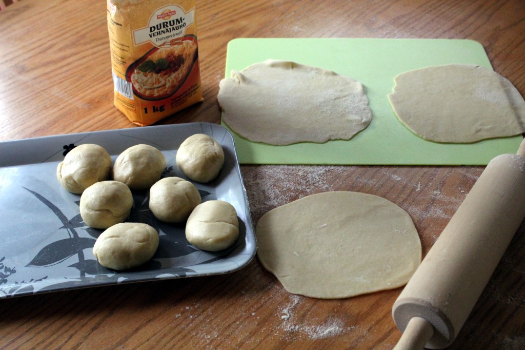 Taikinaan tuli vain durumvehnää, suolaa, öljyä ja vettä. Se toimi. Kun taikinapullat olivat levähtäneet hetken muovikelmun alla, ne olivat valmiit kaulittaviksi.