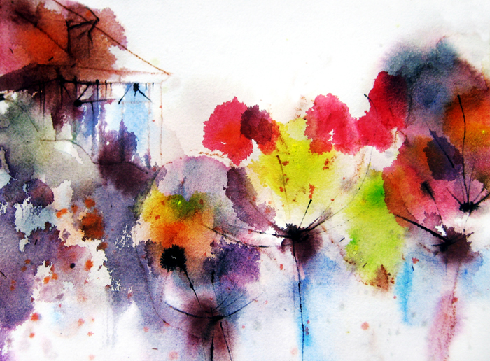 Työskentelimme koko kevään tiiviisti sisätiloissa. Kunnes huhtikuun lopulla pääsin kokeilemaan ulkoilmamaalausta. Istuimme mummorivistönä toppatakit päällä Karhusaaren rannalla tarkkailemassa merta. Navakka tuuli sai aallot välkkymään monen kirjavina. Maalatessa värit kuivuivat niin nopeaan, että kerrosmaalaus onnistui lähes itsestään. Olin oppinut pitämään märkätekniikasta, jossa paperi kostutetaan läpimäräksi. Maalaaminen aloitetaan, kun pinta on jonkin verran kuivunut. Kostea paperi ja runsaan veden käyttö akvarellivärien kanssa saa jatkuvasti aikaan yllätyksiä. Kun niitä oppii hyödyntämään, lopputulos voi olla hyvinkin hieno. Tosin se monesti aivan erilainen kuin aikomus on ollut. Toisin kuin olin kuvitellut, akvarellimaalausta voi jatkaa kerroksittain. Kuiva työ kostutetaan ja parhaimmillaan värikerrokset kuultavat toistensa läpi.