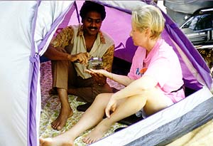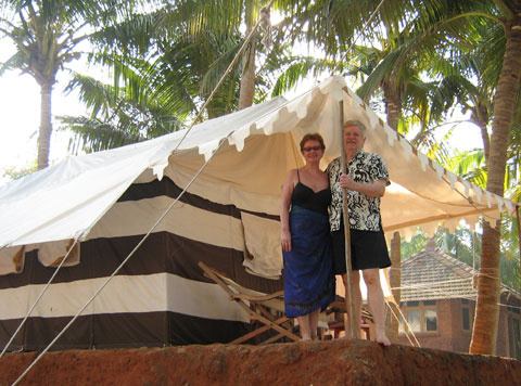 Perjantaina suuntasimme Aurinkomatkojen retkelle etela-Goaan Colan yksityiselle rannalle. Bussimatka kesti kaksi ja puoli tuntia kuoppaisia teita pitkin. Vaiva kannatti, silla perilla meita odotti hienohiekkainen palmuranta, jossa yksikaan kaupustelija ei hairinnyt rauhaa. Majoituimme ylellisiin maharajojen telttoihin, joissa oli oikeat sangyt ja oma suihkuosasto. Teltat olivat mukavasti rinteessa niin, etta jokaisella oli oma terassi, josta voi ihailla merta. Retkipakettiin kuului taysihoito, eli perjantaina buffetlounas ja illallinen, lauantaina aamiainen. Herkullisimpia ruokia olivat erilaiset curryt, uppopaistetut munakoisot seka tonnikalafileet. Jalkiruuaksi tuoreita hedelmia. Uida polskuttelimme palmupoukamassa ja retkeilimme laheisella laguunilla. Illallisen jalkeen kylan pojat esittivat reipasta tanssia ja innostuivat viela laulamaan nuotiolla rumpujen saestyksella. Myos me turistit saimme kokeilla rummutusta. Onneksi joukosta loytyi pari tosi taitavaa rumpalia, ei tarvinnut haveta taitojamme. Ja baari oli auki pitkalle tummaan tahtikirkkaaseen yohon..