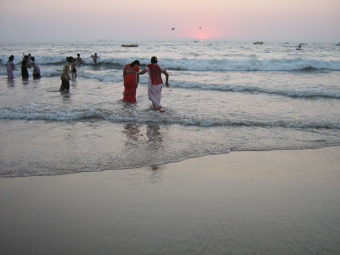 Goan yleisilme on ennallaan, mutta turismi on tuonut edellisen kayntimme jalkeen valtavasti lisaa markkinahulinaa. Calangutea emme tunnistaneet enaa ollenkaan. Rannoilla kay melkoinen hulabaloo. Onneksi meidan hotellimme on rauhallisemman rannan kohdalla. Yhtenaista hiekkarantaa riittaa kahdeksan kilometria. Kelpaa sita patikoida.