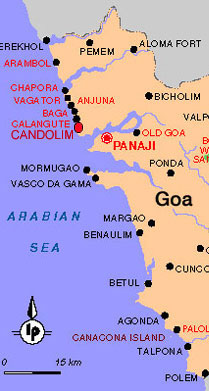 Aurinkoinen lauantaipäivä on vierähtänyt pakkauspuuhissa. Vatsanpohjaa nipistelee jo lupaavasti. Finnairin kone lähtee kello 20:35 ja lento kestää hulppeat 10 tuntia. Lomalennolla on noin tunnin välilasku Sharjahissa – missä ikinä se onkaan.. Perillä Goalla olemme sunnuntaina kello 10:00 paikallista aikaa. Suomessa on silloin varhainen aamu, kello on 6:30. Hotellimme Alor Grande Holiday Resort sijaitsee Pohjois-Goalla Candoliminin kylässä Galanguten eteläpuolella (kartalla punainen piste). Edellisellä Goan vierailulla lähes 12 vuotta sitten asuimme Galangutessa. Onpa mielenkiintoista nähdä, miten maailma on sillä kulmalla muuttunut. Päällimmäisiä mielikuvia ovat aurinko, lämpö, kirkkaat värit, yli-innokkaat kaupustelijat sekä lehmät kaiken keskellä, myös rannoilla.