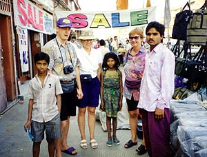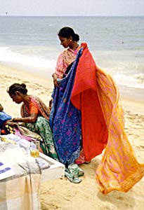 Eilen oli ostospäivä. Kiersimme aamupäivän kylän basaareissa ja tingimme ahkerasti. Ostimme repun, joka värjää olkapäät mustiksi. Minä sain shortsihaalarit, joihin en mahdu. Parempaakin löytyi: silkkihuiveja tuliaisiksi hintaan 50 rupiaa kappale. Silkkishortsit, pari lakkia, mogulikalenteri. Riipukset lapsille: aurinko ja sisilisko, ganesha -silkkipainokuva. Sovitimme Jaanan kanssa pitkään mustia kulta- ja hopeakoristeisia juhlapuseroita. Jaana suunnitteli asuja napatanssiin, minä linnan juhliin. Ostimme hepeneet yhteishintaan 450 rupiaa.
