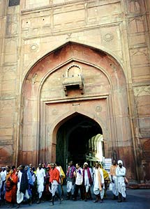 Red Fortin ympäristö oli kuin elokuvasta. Polkupyöräriksoja, hunnutettuja naisia, kilipukkeja, kärpäsiä, väkeä joka puolella. Mekin otimme polkupyöräriksan keskustaan. Poika polki 25 rupialla tosissaan.