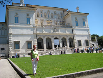 Kierroksemme alkoi lauantaiaamuna Villa Borghesessa. Huvila oli ulkopuolelta vaatimattoman oloinen. Olimme soittaneet ja varanneet vierailuajan Suomesta käsin. Se osoittautui viisaaksi, sillä lippuluukulla oli teksti, jonka mukaan kaikki ajat olivat täynnä tiistaihin asti. Sisään päästyämme olin jo eteishallissa täysin häikäistynyt. Huvila oli pieni, mutta sitäkin täydellisempi. Kaikki huoneet oli koristeltu ylenpalttisesti. Alakerran saleista löytyi toinen toistaan taidokkaampia veistoksia. Kuuluisin lienee Canovan veistos Napoleonin sisaresta Pauline Borghesesta Venuksena. Ihailimme, miten taitavasti Bernini oli käsitellyt marmoria mestariteoksessaan Apollon ja Dafne, jossa Dafne pakenee auringonjumala Apollonin luota ja muuttuu laakeripuuksi. Viimeisessä huoneessa vedin henkeä. Kattomaalauksissa häpeämättömästi virnistelevät satyyrit viettivät bakkanaaleja. Seinämaalauksissa Caravaggion nuoret kalvakat pojat kantoivat hedelmäkoreja. Ne nähtyäni olin täysin Caravaggion lumoissa. Yläkerran galleria oli omistettu maalaustaiteelle. Suurikokoinen Tizianin maalaus Taivaallinen ja maallinen rakkaus pysähdytti. Olimme niin uppoutuneita taideteoksiin, että kaksituntisen vierailuajan loppuminen yllätti. Ehdin luoda viimeisen silmäyksen Rafaelin herkkään maalaukseen Nainen ja yksisarvinen, kun meidät jo komennettiin ulos ja seuraava erä turisteja tungeksi sisään.