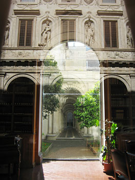 Rauhallista oli myös Palazzo Spadassa. Saimme yksityisesittelyn Borrominin suunnittelemaan hämmästyttävään perspektiivikäytävään. Minua kiehtoi jo Villa Borghesessa silmänhämäysmaalaukset. Trompe l’oeil niin kuin taidehistorianopettajani Eeva muisti usein luennoilla mainita. Täällä hämäys oli viety äärimmilleen. Käytävä oli neljä kertaa todellista pitempi ja niin hienosti toteutettu, etteivät silmät todellakaan tahtoneet uskoa sitä todeksi.
