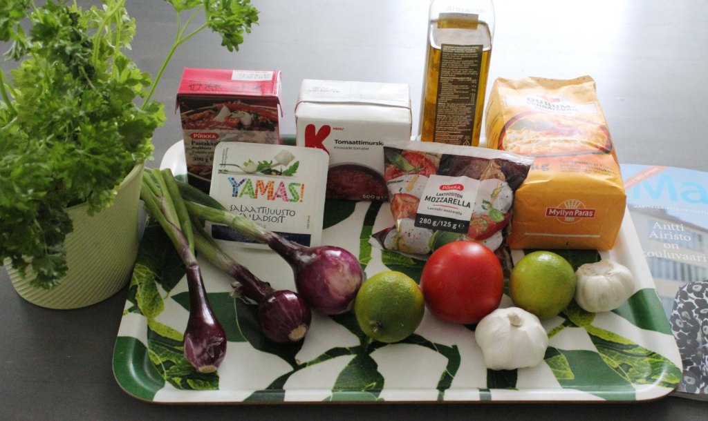 Ostin kilon pussin durum-vehnää, valmista chili-tomaattipastakastiketta sekä mozzarellaa ja vahvaa juustoa.