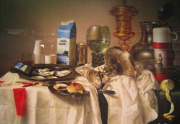 Nämä hollantilaiset ovat huumorintajuisia. Vanhojen mestareiden töistä oli tehty nykyversioita. Asetelmamaalaukseen oli lisätty mm. maitotölkki ja muovimukit. Näitä veikeitä uusioteoksia näkee katukuvassa mainosjulisteina.