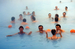 Eilinen elämys oli Blue Lagun – kokemus kuin avaruuselokuvasta. Laavamaisema, karua, vain kiveä ja sammalta. Voimalaitos keskellä maisemaa ja sininen – kirjaimellisesti – laguuni. Mentiin uikkareissa tuulen ja sateen poikki. Vesi oli lähes kuumaa ja turkoosinsinistä. Meille tarjoiltiin veteen sinisiä coctaileja. Taas floating bar! Kaiken yllä oli höyryä, niin ettei maisemasta näkynyt mitään. Pohjassa oli isoja laavakiviä. Huikaisevan epätodellinen juttu. Buffet –illallisella tarjottiin voileipiä, olutta (Viking -merkkistä) ja hedelmiä. Vadit oli hetkessä tyhjiä uintireissun jälkeen.