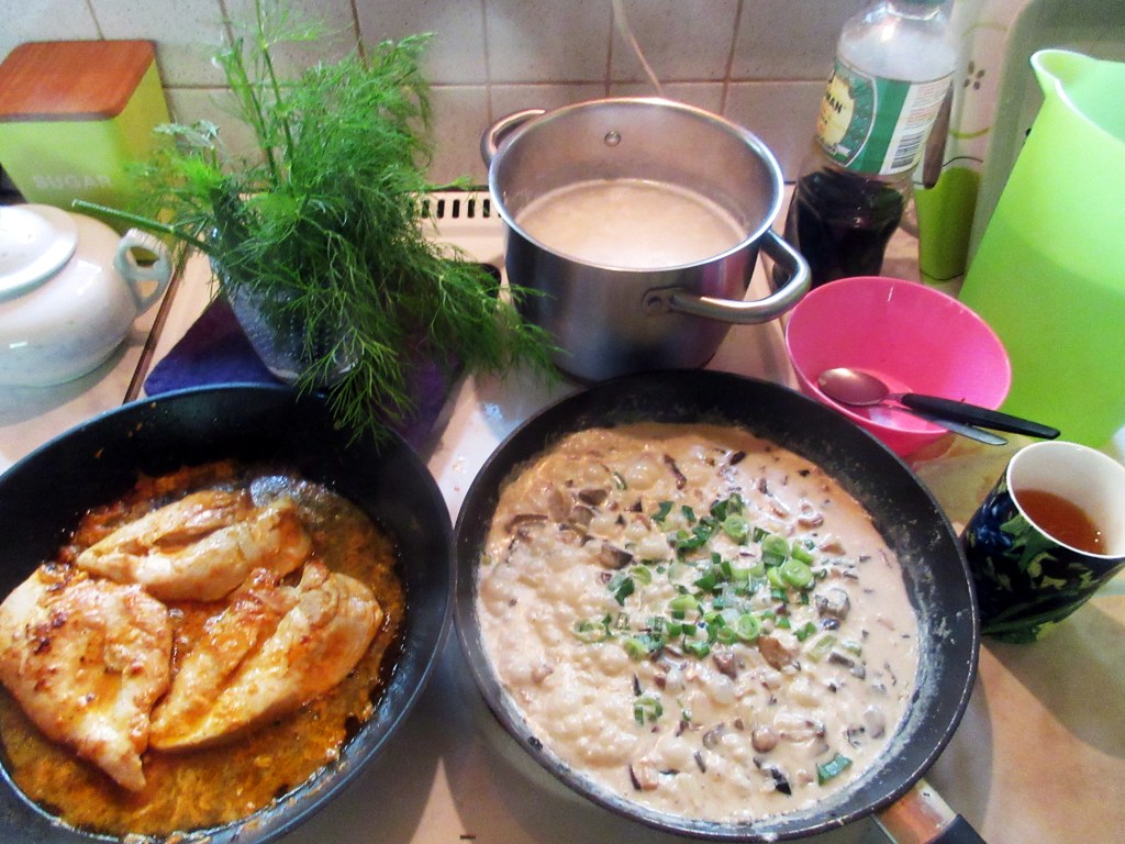 Kokkasin lounaaksi poikien suosikkiruokaa broilerifileitä ja riisiä. Aikuisille maistuivat porsaanfileet, sienimuhennos ja kaalisalaatti.
