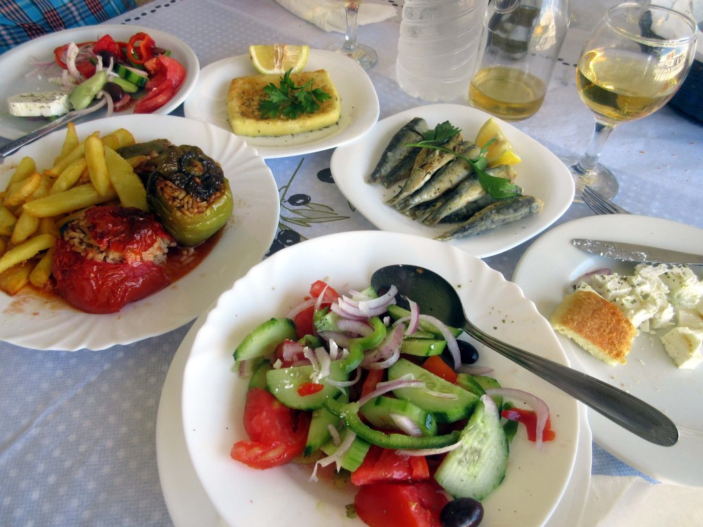 Olimme kovasti tyytyväisiä, sillä ruoka oli hyvää ja sitä oli runsaasti. Jaksoimme hädin tuskin käydä hakemassa kaupasta aamiaistarvikkeet. Pienet lasilliset ouzoa tuudittivat meidät syvään uneen.
