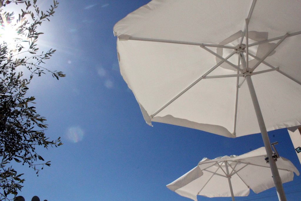Merivesi tuntui mukavan lämpimältä. Emme vielä uskaltautuneet uimaan, mutta ehkäpä jo huomenna. Istahdimme rantatavernan terassille virkistäytymään. Suolainen tuuli tuiversi mukavasti, mutta aamulla Arjalla oli kurkku kipeä.