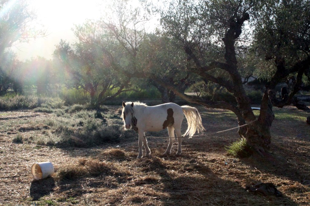 Näimme matkalla kukkivia puutarhoja ja komeita vanhoja oliivilehtoja sekä hevosia laitumilla.