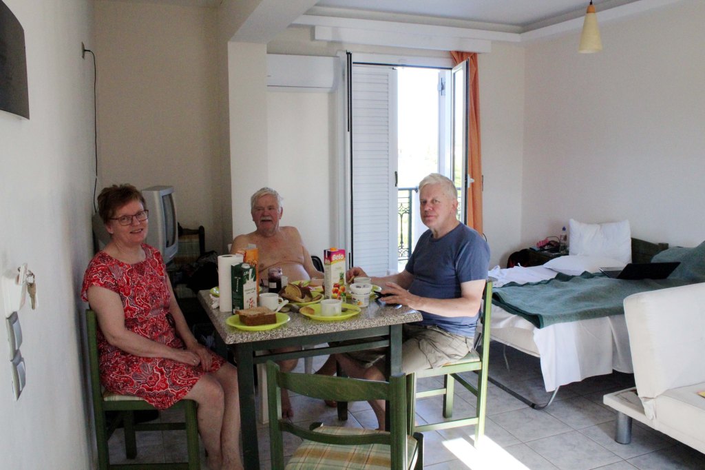 Miehet kävivät ensi töikseen läheisessä supermarketissa. Jääkaappi on nyt lupaavan täynnä virvokkeita. Söimme aamiaisen hotellin snack baarissa. Kreikkalainen annos oli huomattavasti maukkaampi kuin Jussin ja Eskon valitsema tukeva englantilainen. Minulla on kutina, että viihdymme täällä.