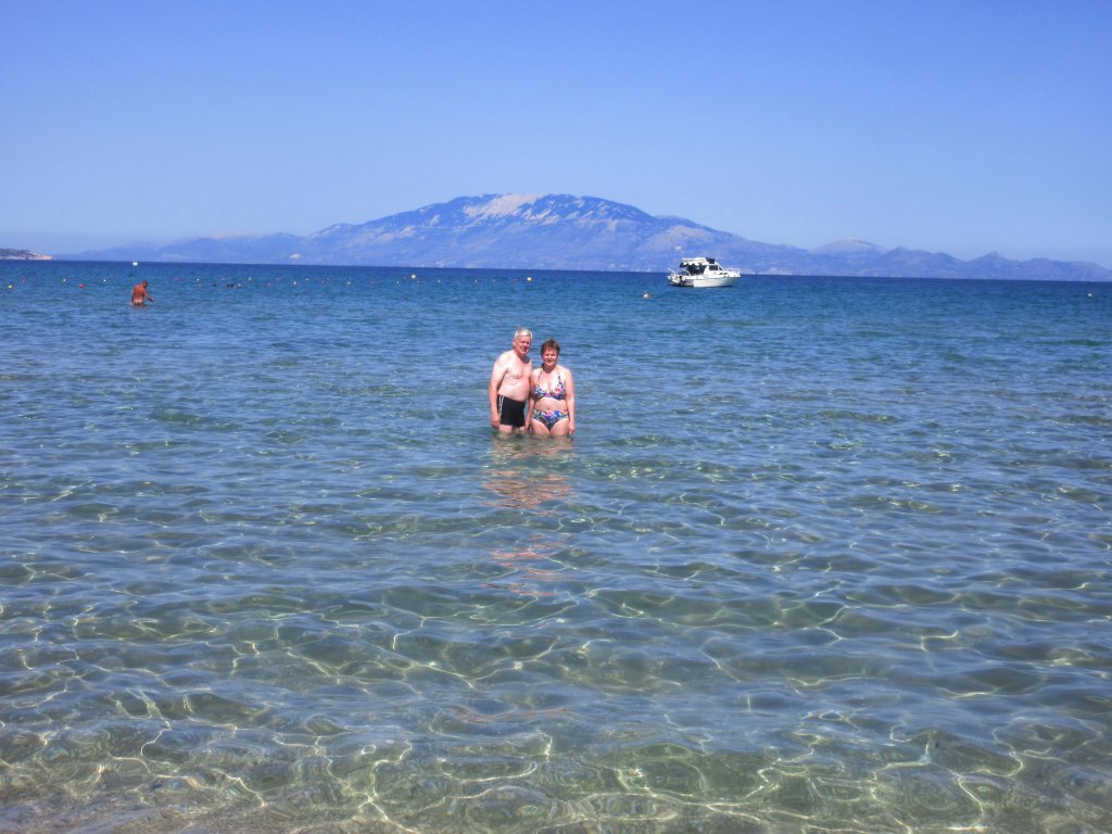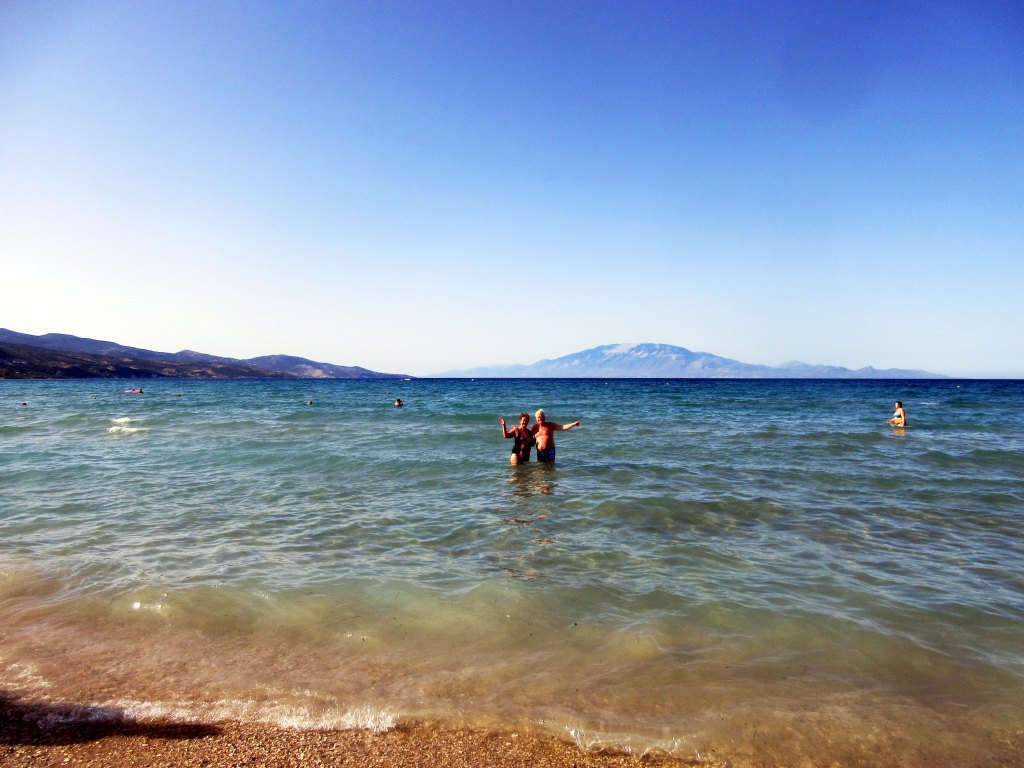 Näillä eväillä majoituimme Alykanasin rannalle. Merituuli hiveli ja kirkas merivesi oli huomattavasti lämpimämpää kuin altaamme vesi. Pohja oli hienoa hiekkaa.