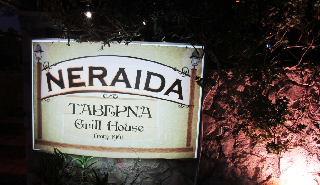 Neraida-taverna mainosti barbeque-iltaa ja elävää musiikkia. Olimme Jussin kanssa käyneet edellisenä iltana varmistamassa, että grilli on kuumana.