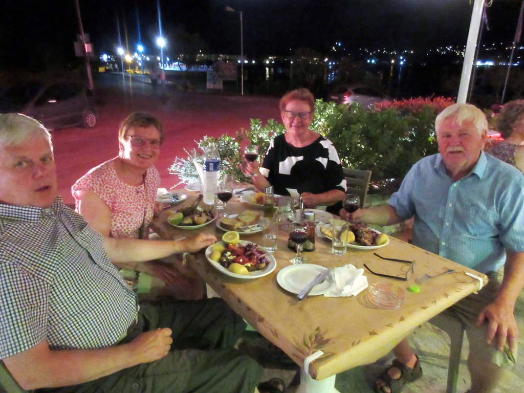 Ilta viileni ennen kuin herkut oli nautittu. Lasilliset metaxaa lämmittivät sopivasti ennen paluumatkaa. Onnentoivotuksemme vielä Arjalle. Juhlimme hänen viisikymppisiään Kreetalla, nyt kymmenen vuotta myöhemmin Zakynthosilla, missähän seuraavaksi?
