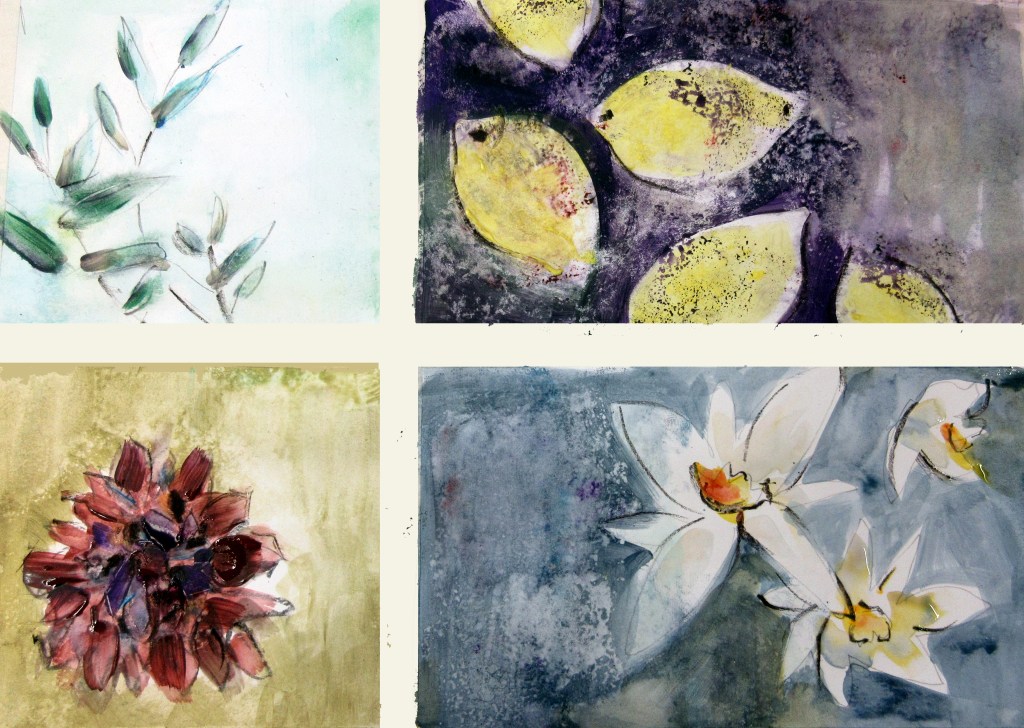 Opettajana oli tuttu graafikko Anna Kolehmainen. Hän antoi meille heti kättelyssä hauskan haasteen. Saimme haistella sokkona neljää tuoksua ja maalata sen jälkeen mielikuvia niistä. Tuoksut olivat seetri, sypressi, laventeli ja piparminttu. Minä arvasin joka ikisen väärin, mutta se ei maalaamisen iloa haitannut!