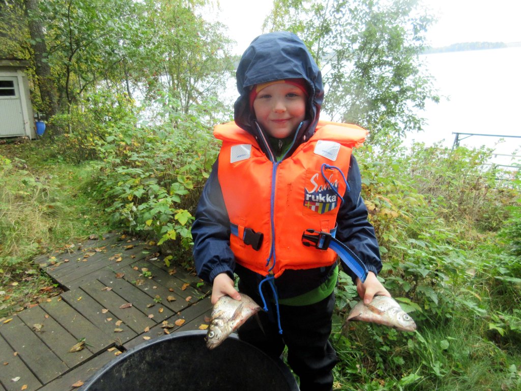 Otso esitteli ylpeänä lahnasaalista. Laura lupasi tehdä niistä kalapullia.