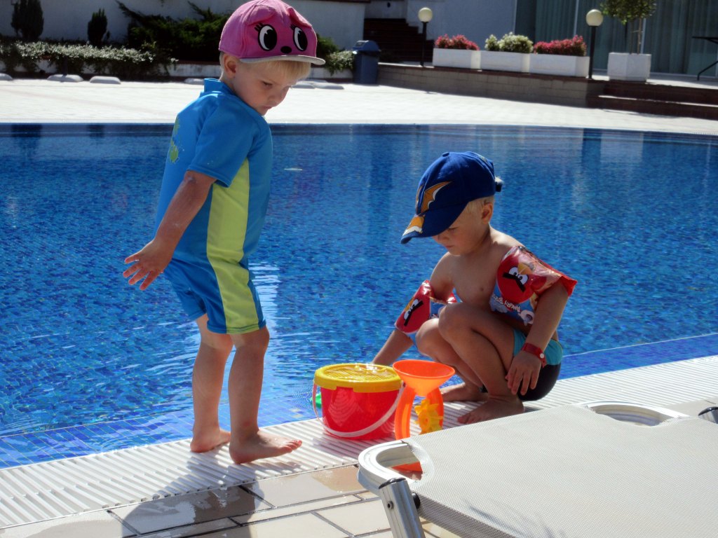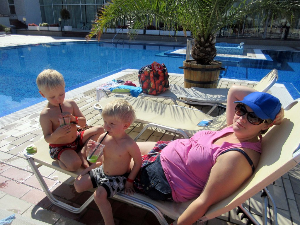 Päiväjärjestyksemme on ehtinyt kahdessa päivässä vakiintua. Aamiaiselle yhdeksältä, leikkipuistoon seuraavaksi, sitten altaalle ja lounaalle. Lepohetken jälkeen rantaan ja suihkuun, seitsemältä illalliselle. Sieltä minidiskoon ja iltatoimiin.