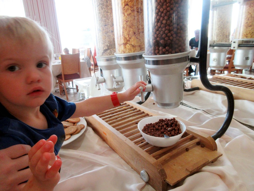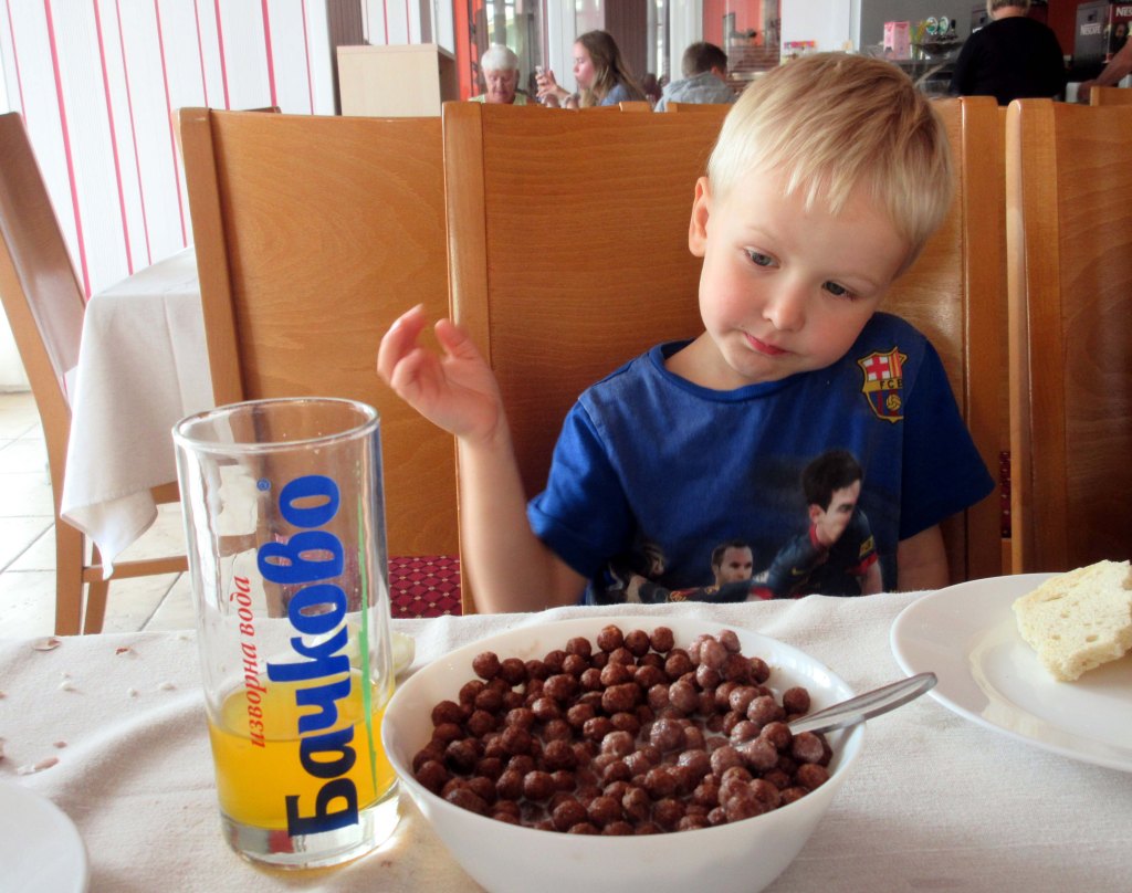 Samu ja Miska herkuttelevat aamuisin muroilla ja vesimeloneilla. Löysimme yllättäen myös puuroa.