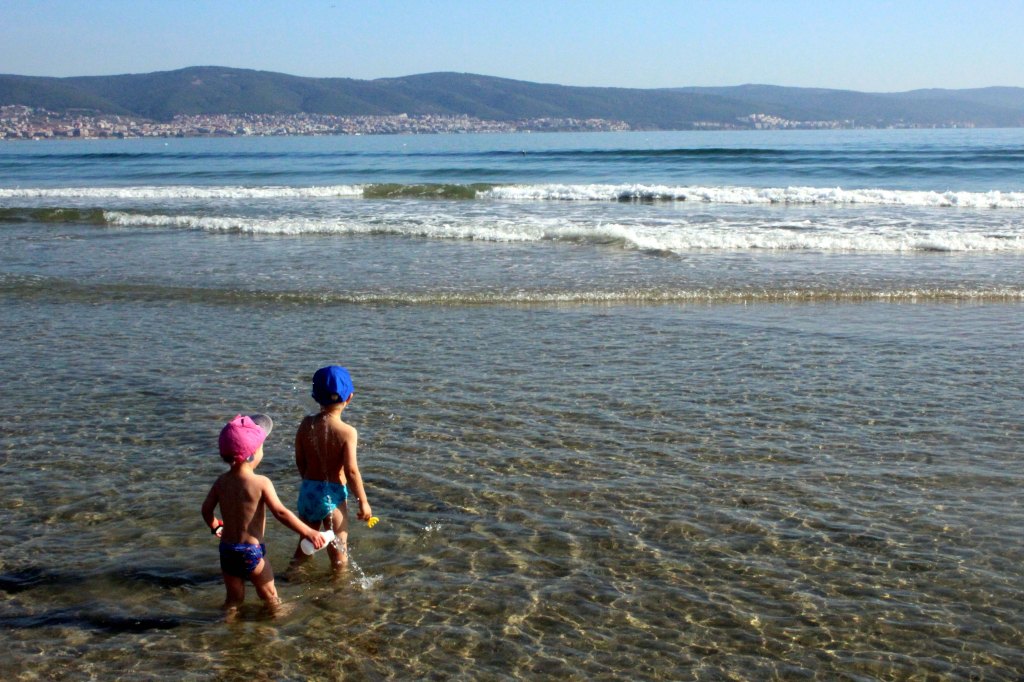 Pojat kirmailivat innoissaan rantavedessä ja olivat hetkessä läpimärkiä. Vaihtovaatteita ei ollut matkassa. Lupasimme tulla uudemman kerran hiekkalelujen ja uikkareiden sekä pyyhkeiden kera. Hiekkalelujen löytäminen ei ollutkaan mikään helppo tehtävä.