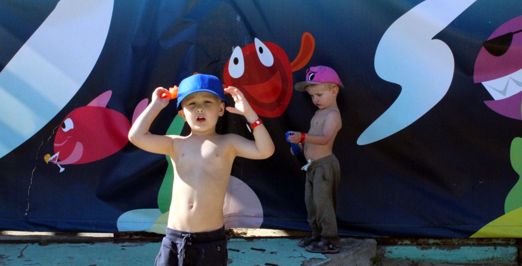 Pojat touhusivat lastenaltaan reunalla ja uittivat leluja ja muovikenkiään. Anna kahlasi hakemaan karkulaiset.