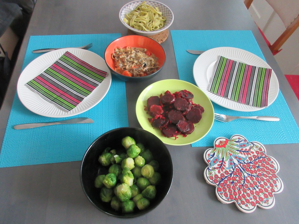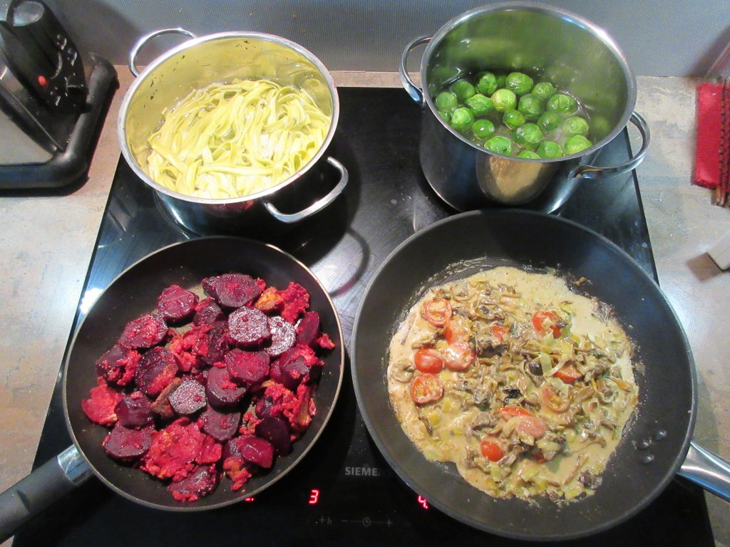 Kiehautin väriläikäksi rasiallisen ruusukaaleja. Ne pitää kuoria aika reippaasti, jotta karvaus häviää. Kolmen minuutin kypsennys riitti pinaattituorepastalle. Syysaterian kruunasi kermamuhennettu suppilovahverokastike. Vaikka ruuanlaitto vaati monta kattilaa ja pannua, lopputulos oli vaivan arvoinen. Ja mikä parasta, siitä riittää maukas annos meille molemmille vielä huomiseksi.