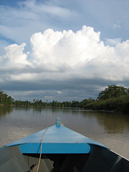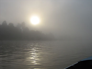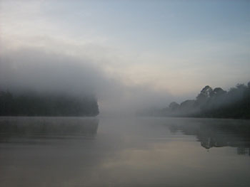Meilla oli sama rauhallinen tunnelma, kun veneemme lipui sunnuntaiaamuna pitkin jokea aamu-usvassa. Katselimme kun aurinko nousi sumun keskelta. Apinaperheet olivat aamupuuhissa joen rannan puissa. Jos eilinen retki oli upea, tama oli viela monin kerroin vaikuttavampi.