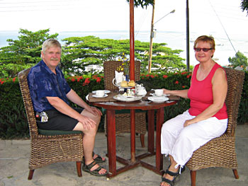 Saavuimme eilen illalla tayspimean aikaan saarelle. Oli aika hulppeaa, kun lentoaseman edessa oli hotellipoika heilutellen isoa kylttia MARJALEENA. Hotellimme Casuarina on rannan tuntumassa ja se on parhaat paivansa jo nahnyt. Terveiset Liille ja Kaizulle, ymmarratte varmaan mita tarkoitan. Meilla kun oli samansuuntaisia matkakokemuksia viime kevaana Mauritiuksella.